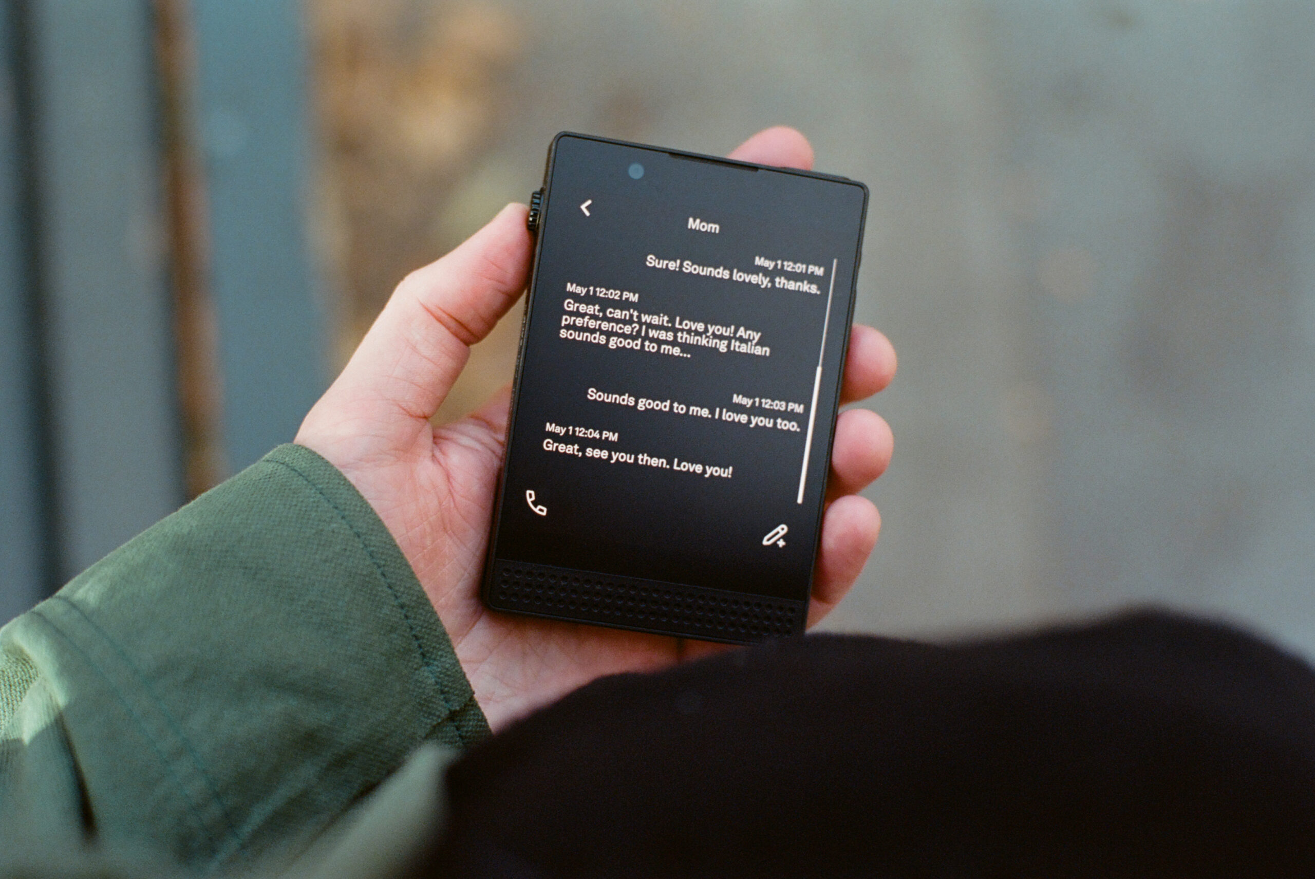 A distraction-free minimalist phone for intentional living, featuring a matte black-and-white OLED screen and tactile physical controls. It includes modern essential tools designed to simplify your digital life.